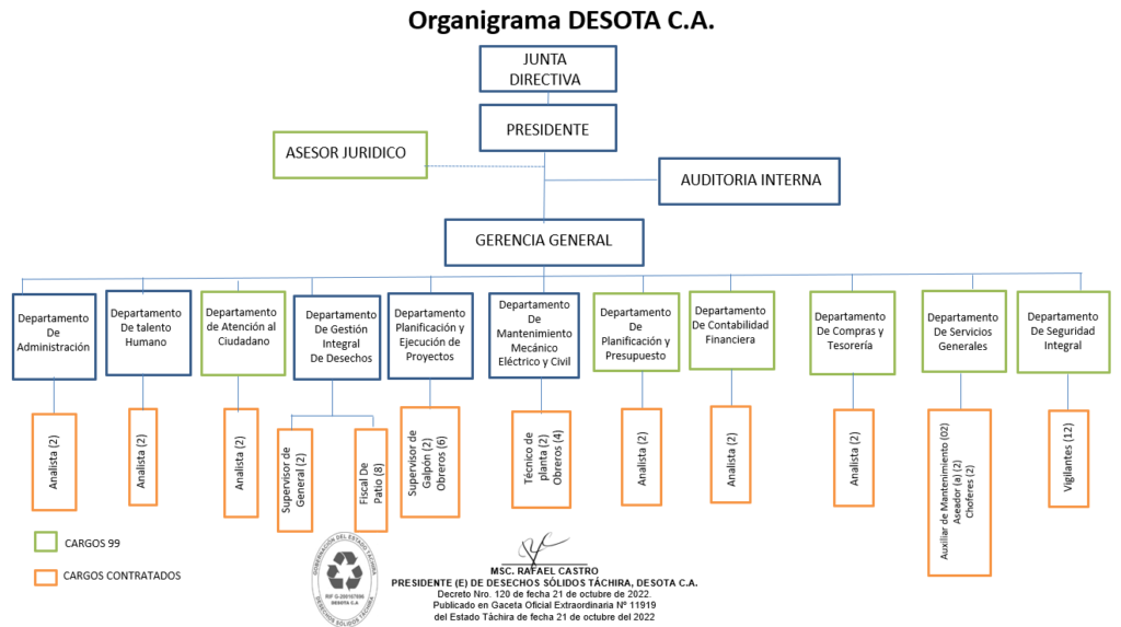 Desechos sólidos Táchira, DESOTA, C.A. tiene como objeto  el control, recolección, acopio, disposición final, reciclaje, reutilización, procesamiento, transformación, transporte y la comercialización, en el mercado nacional, de materias primas obtenidas de los tipos de basuras: fermentables (tierras negras y abonos) y no fermentables; institucionales; industriales; farmacéuticos; biológicos-patológicos; materiales no ferrosos; materias primas susceptible al reciclaje: plásticos, polímeros de alta y baja densidad, neumáticos fuera de uso, cartón, papel, pilas y baterías, residuos electrónicos residuos mobiliarios y de bienes utilitarios, productos químicos, lubricantes, aceites vegetales o industriales y maderas. Todos estos materiales provenientes de los sectores: domésticos, comerciales, industriales, institucionales y de salud a nivel nacional, así como de los Organismos del Estado, Gobernaciones, Alcaldías, Ministerios, Institutos Autónomos, Educativos a todos los niveles incluyendo: Universidades, Tecnológicos e Institutos de Investigación Científicas.